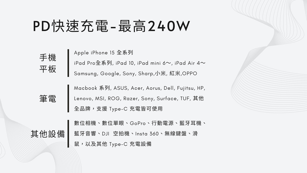 - 支援 PD3.1 240W 充電